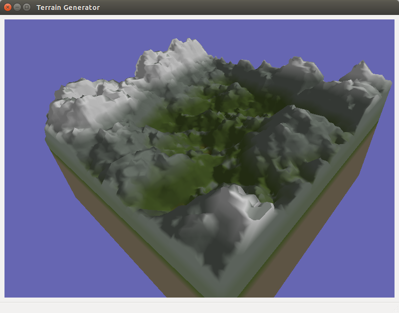 My next step was to make our terrain look a little more natural by rendering the terrain in a slightly more creative manor. For which I have used the technique in A rule-base approach to 3D terrain generation via texture splatting by Jonathan Farraris and Christos Gatzidis. This implementation shades the geometry based on the heights and the normals of its points. For example lower points are mud and grass shaded with brown and green and as the height increases it becomes rocks and snow shaded with grey and white. To further greater this we use the normals to identify sheers cliffs and shade them as rock instead of grass or snow. We can do this by calculating the angle through inverting the y component of the normal and multiplying it by 90. Now we just set a user defined thresh hold of faces above a certain again to shade as cliffs. In our program I have implemented to version of this, one with just block colours and one that uses pre created textures of our different types of terrain.